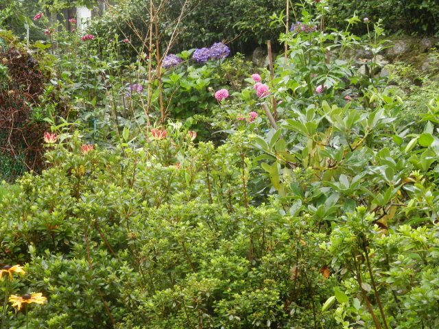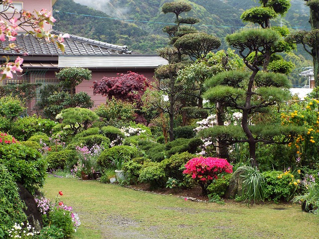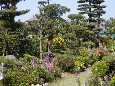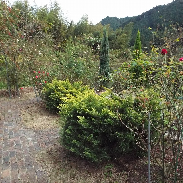 | 借景にマッチしたバラの庭・・山の斜面を利用してバラ園を作庭しておられる方です。