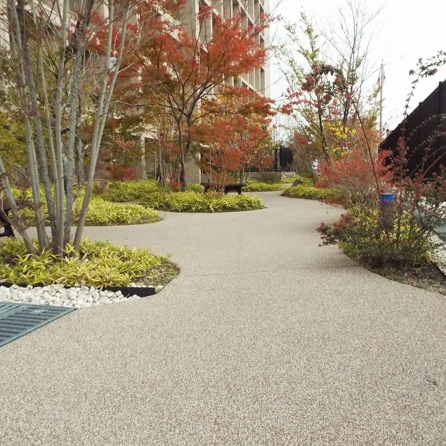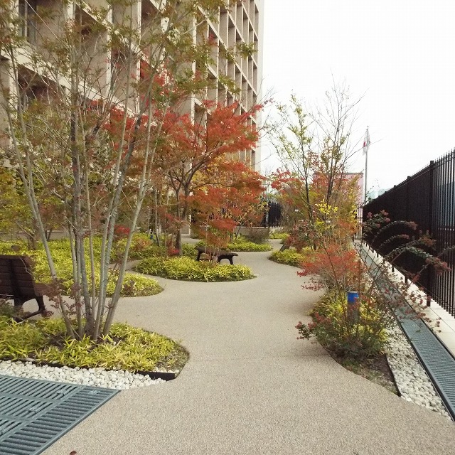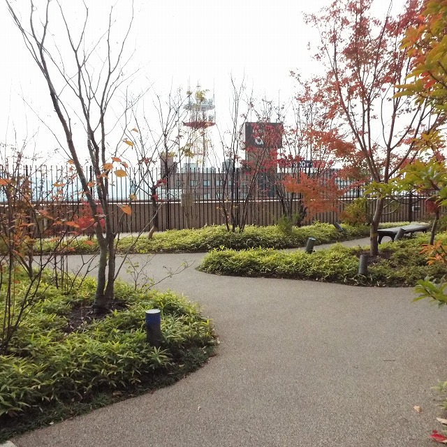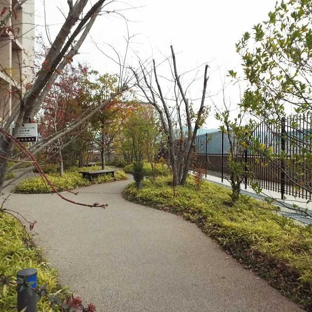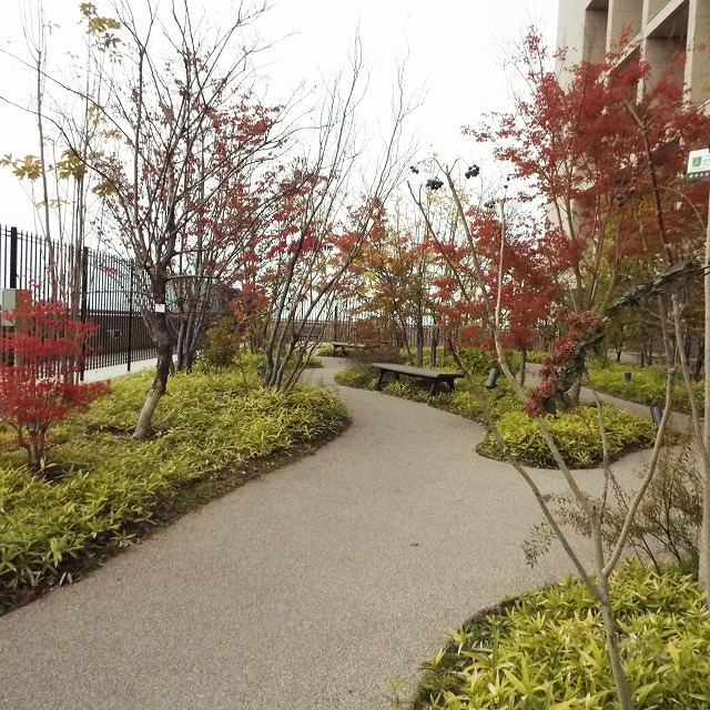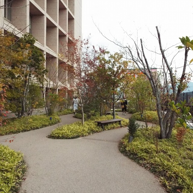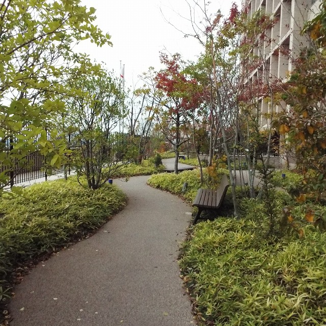 6階に設置されている空中庭園を見に行きました。庭園は長さが約100m、幅10mくらいの広さがあり、患者さんのリハビリのため歩きやすい道とベンチが